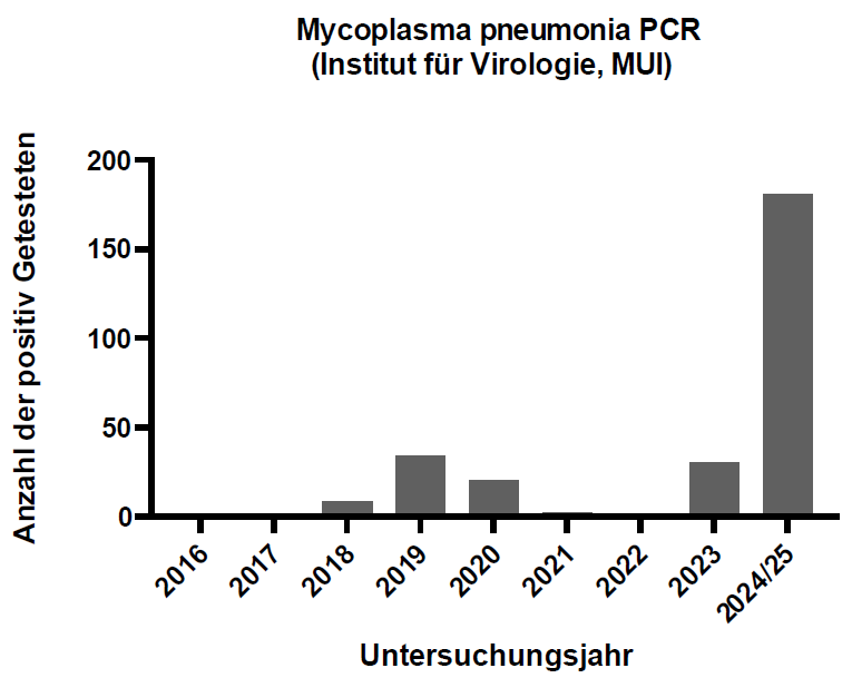 Alarmingly high M. pneumoniae activity has already been reported, increasing worldwide since late 2023, particularly in Europe and Asia (Bolluyt D et al 2024, Shi D et al 2024). We are also seeing a massive increase in cases since 2024 in our laboratory diagnostics (see Fig. 1).