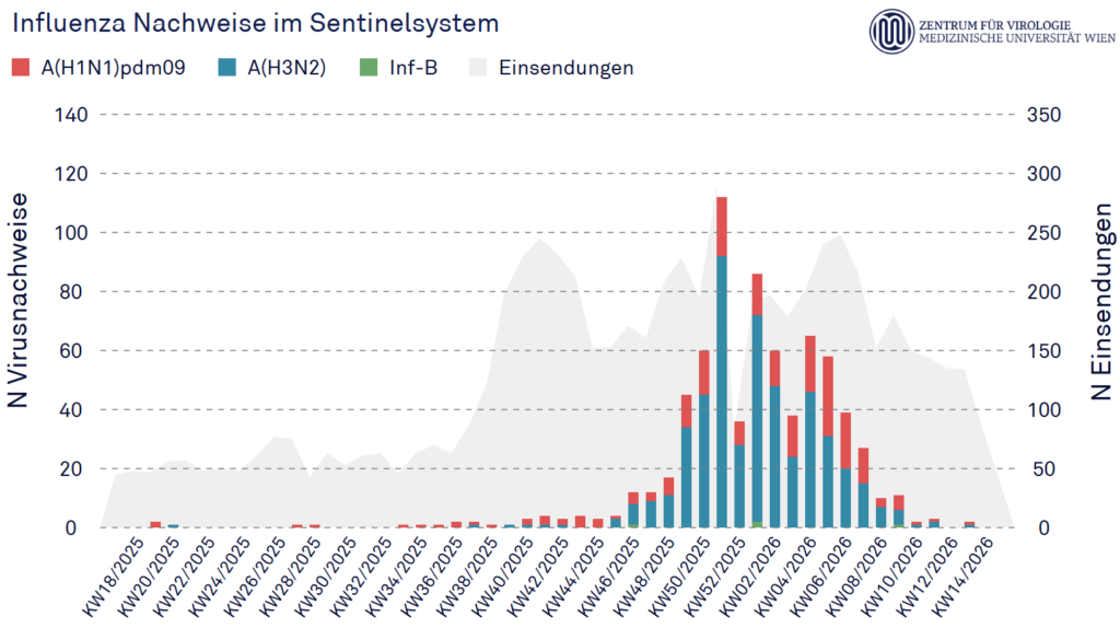 - Die Influenzasaison 2025/26 in Österreich zeigt laut aktuellen Wochendaten erste Zeichen des Abklingens.
