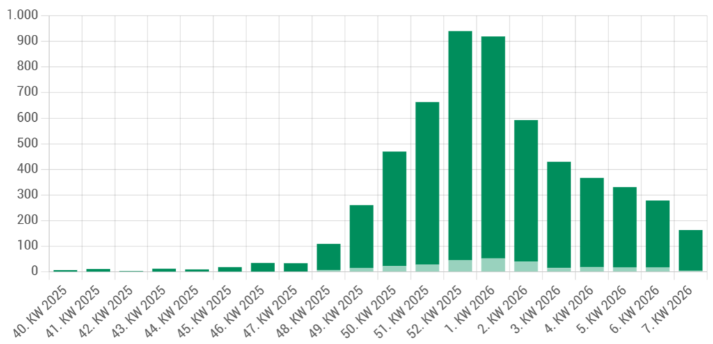 Die jüngsten wöchentlich erhobenen Influenza Nachweiszahlen deuten auf ein Abklingen der aktuellen Influenzasaison 2025/2026 hin (Abb. 1)