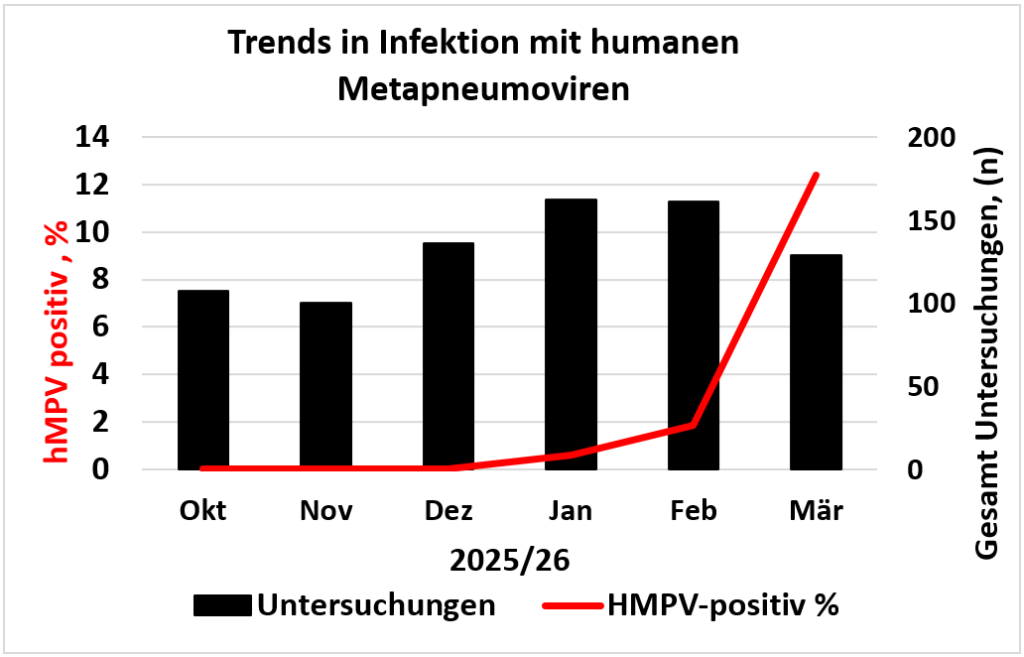 Während die RSV-Fälle in den vergangenen zwei Wochen zurückgegangen sind, verzeichnen wir aktuell einen deutlichen Anstieg der Infektionen mit humanem Metapneumovirus (hMPV). Obwohl es von Oktober bis Dezember 2025 in unserem Kollektiv bei insgesamt 340 durchgeführten respiratorischen Multiplex-PCRs kein hMPV nachgewiesen wurde, zeigt sich seit Jahresbeginn ein sukzessiver Anstieg der Positivitätsraten: von 0,6 % im Januar über 1,8 % im Februar auf über 12 % im März (vgl. Abb). In gemäßigten Klimazonen häuft sich hMPV typischerweise vom späten Winter bis ins Frühjahr – häufig direkt im Anschluss an den RSV-Peak.